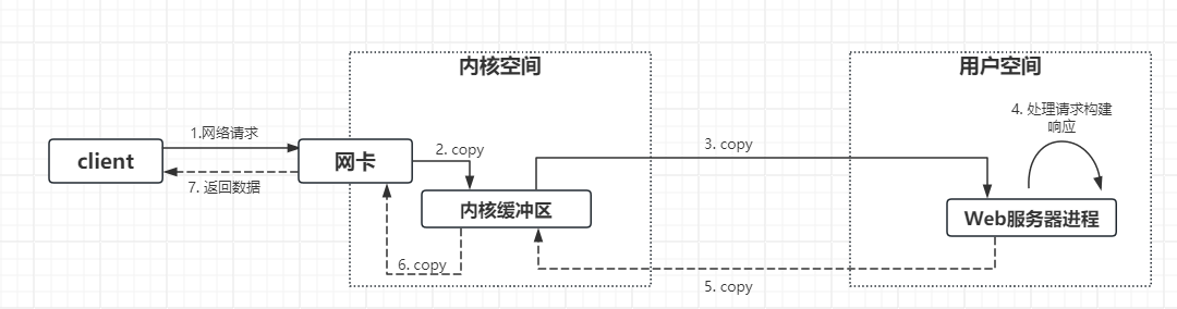 • 返回数据,服务器将已构建好的响应通过内核空间的网络I/O发送给客户端(5-7)