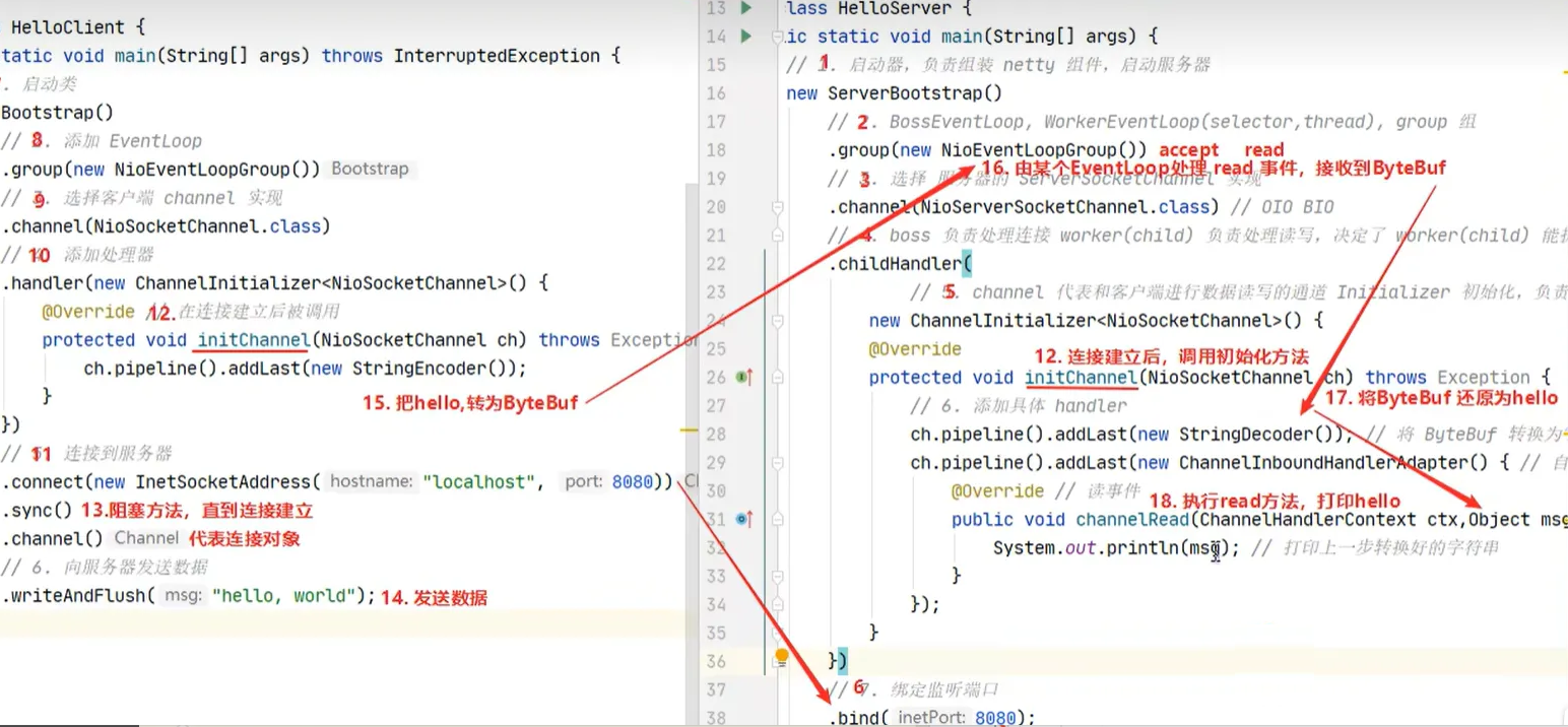 // 5. channel代表和客户端进行数据读写的通道,Initializer初始化,负责添加别的handler