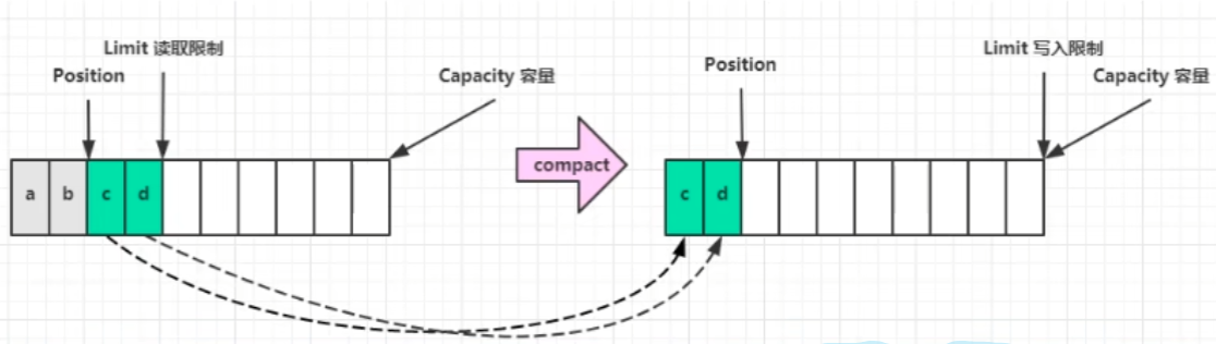 流程: 初始状态 写模式下,position是写入位置,limit等于容量,写入四个字节后的状态 flip动作发生后,position切换为读取位置,limit切换为读取限制 读取四个字节后的状态 clear动作发生后 compact方法,是把未读完的部分向前压缩,然后切换至写模式